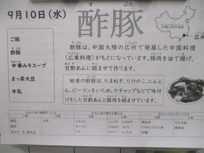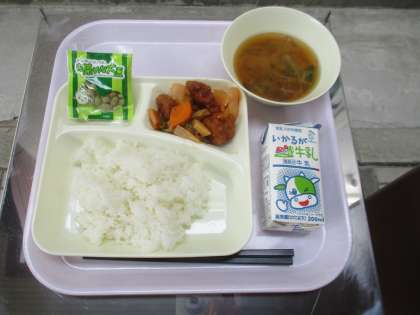 今日の給食の献立は、ご飯、酢豚、中華みそスープ、まっ茶大豆、牛乳でした。