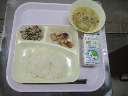 今日の給食の献立は、ご飯、さけのしょうゆだれかけ、五目汁、高野どうふのいり煮、牛乳でした。
