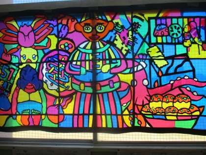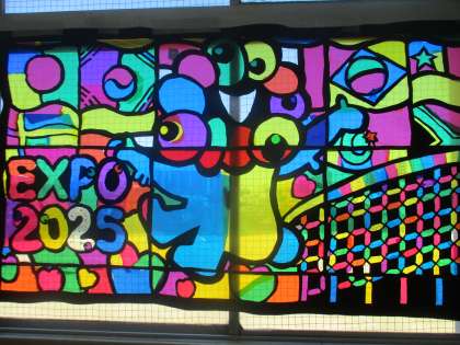 大阪を代表する風景を、ステンドグラスで色鮮やかに表現しています。