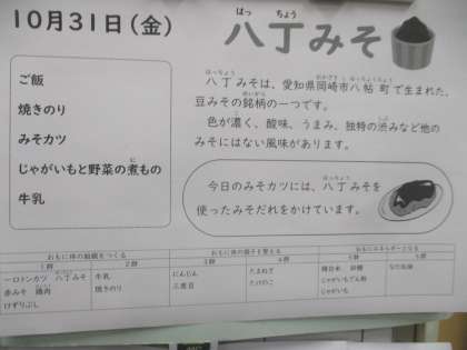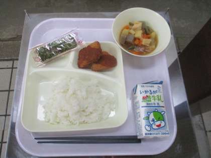 今日の給食の献立は、ご飯、焼きのり、みそカツ、じゃがいもと野菜の煮もの、牛乳でした。