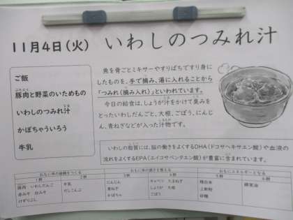 今日の給食は、しょうが汁をかけて臭みををとったいわしだんごと、大根、ごぼう、にんじん、青ネギなどが入った汁ものです。