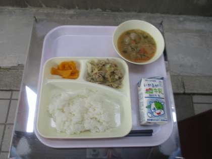 今日の給食の献立は、ご飯、豚肉と野菜のいためもの、いわしのつみれ汁、かぼちゃういろう、牛乳でした。