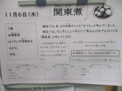 今日の給食では、鶏肉やうずら卵、ごぼう平天、じゃがいも、こんにゃく、あつあげ、大根、にんじんを使用しています。
