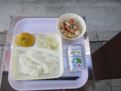 今日の給食の献立は、ご飯、関東煮、白菜の甘酢あえ、みかん、牛乳でした。