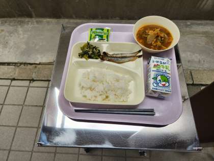 今日の給食の献立は、ご飯、焼きししゃも、和風カレー汁、ささみと小松菜のいためもの、まっ茶大豆、牛乳でした。