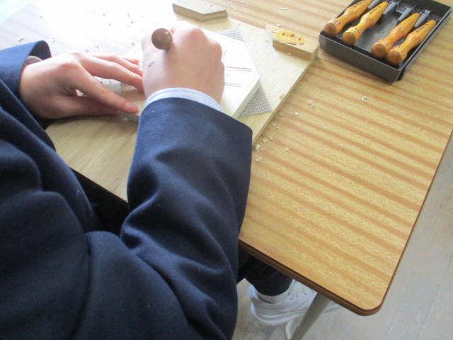 木彫に取り組んでいます。今日の授業では、荒彫りから仕上げに取りかかろうとしています。