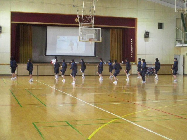 ダンスに取り組んでいます。表現力やリズム感、協調性(チームワーク)の養います。今回の授業では、基本的なステップの習得に取り組んでいます。
