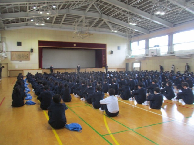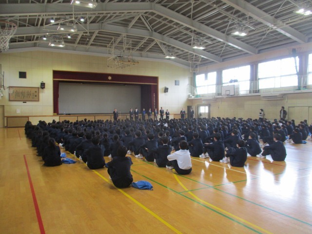 修了証を受け取ったのち、校長先生・生徒指導主事から、進級に向けての心構えについてのお話がありました。そして、その後、離任式が行われました。異動する先生方との別れを惜しみ、感謝の気持ちを感じる場となりました。