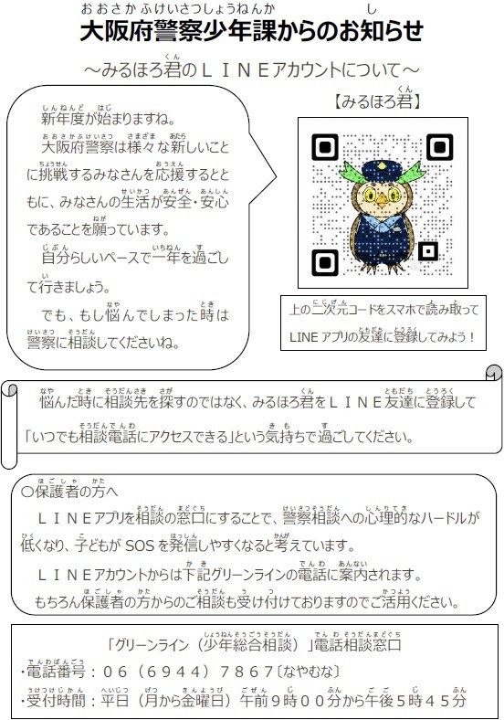 新年度における少年相談LINE アカウント等の周知について(依頼) 大阪府警察少年課からのお知らせ