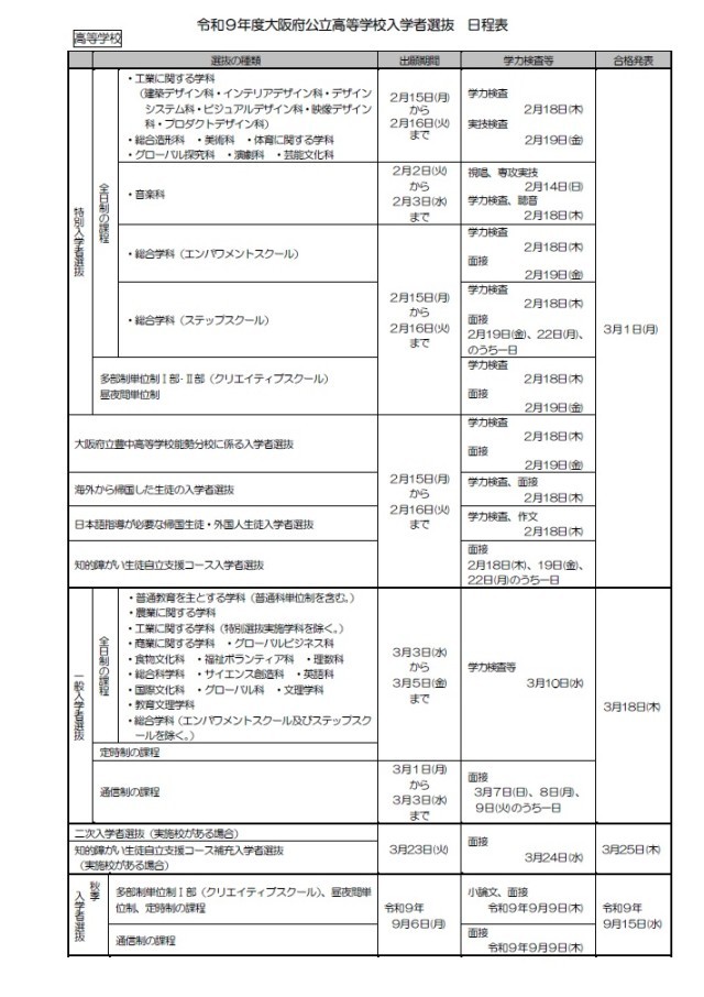 <令和8年4月9日>令和9年度大阪府公立高等学校入学者選抜 日程について