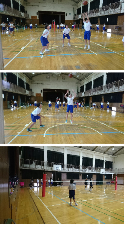 体育館では、狭い中、女子バスケットボール部、女子バレーボ