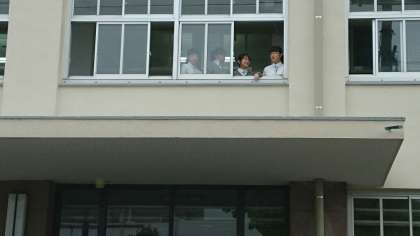 2階から見守り、お出迎えの生徒たち。