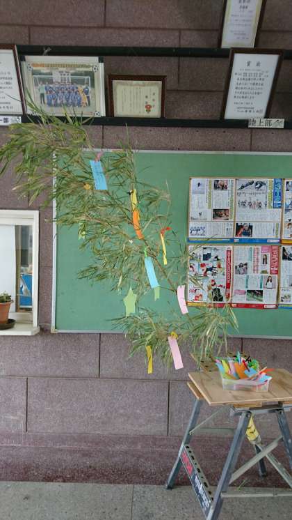 正門から校舎へ、と七夕の笹の葉があります。願い事を書いてつるす