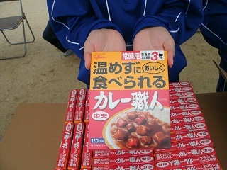 避難誘導のテントでは、バケツリレーの景品として、非常食用のカレーを配布していました。