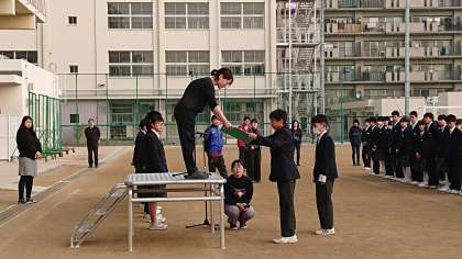 本日の全校集会で、生徒の保健委員会より給食を作ってくださっ
