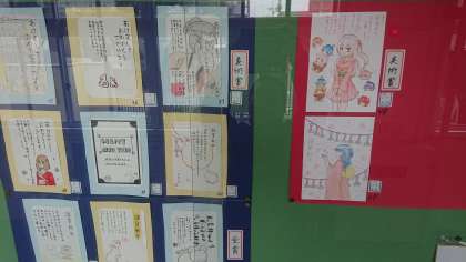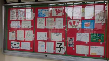 職員室前の掲示板には、美術の作品が飾られています。