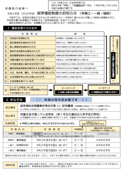令和2年度(2020年度)就学援助制度のお知らせ(一般・随時)
