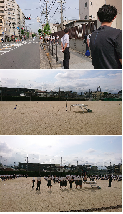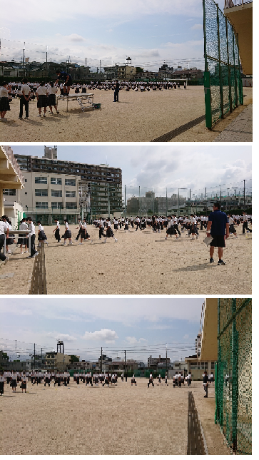 全校生徒が登校し、全校集会が間隔をとってグラウンドで行う