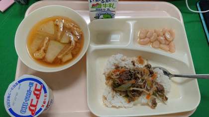 今日の献立は牛丼、とうがんのみそ汁、大福豆の煮もの、ヨー
