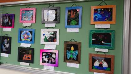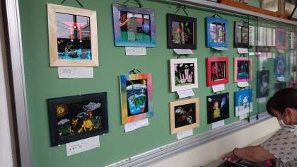 職員室前の掲示板には3年生が2年生時に作成した作品が