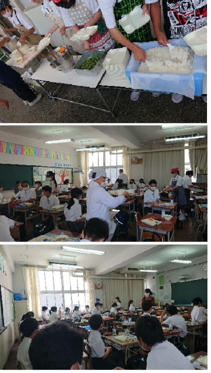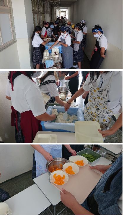 エプロン、三角巾、マスクとちゃんと身につけ役割分担も