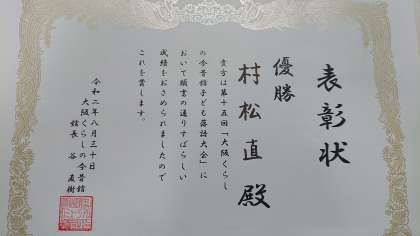 第15回「大阪くらしの今昔館子ども落語大会」で優勝した表彰で