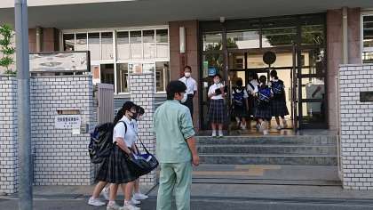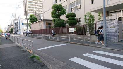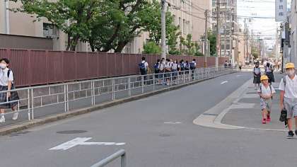 朝の登校風景です。台風も去り晴れ間も見えています。