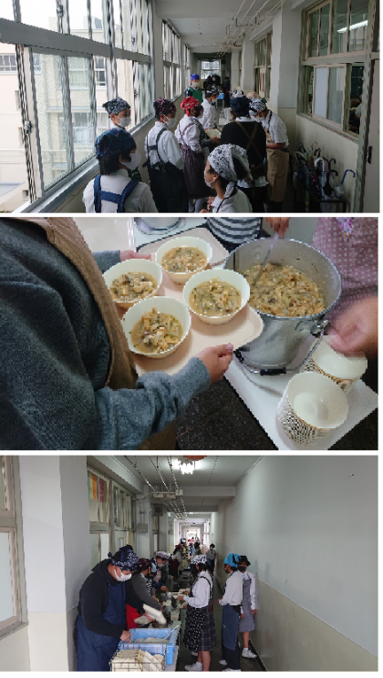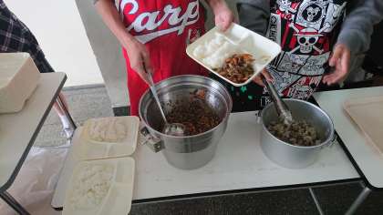 今日の献立は、牛肉きんぴらちらし、みそ汁、キャベツの赤