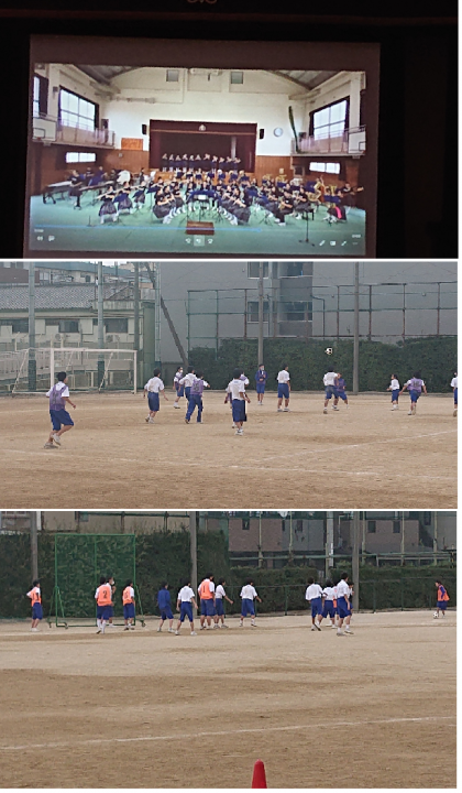 グラウンドでは体育の授業(サッカー)が行われていま