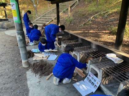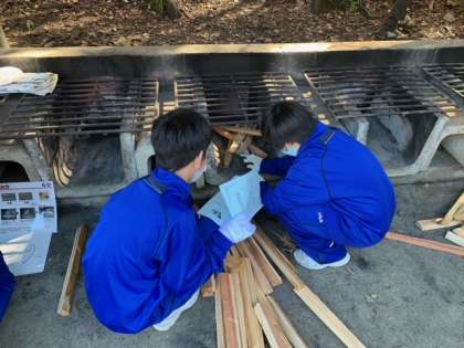 食器、調理器具などを用意し、かまどの準備も順調です。