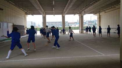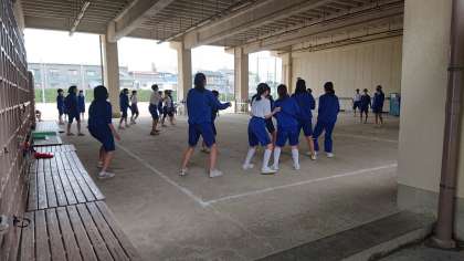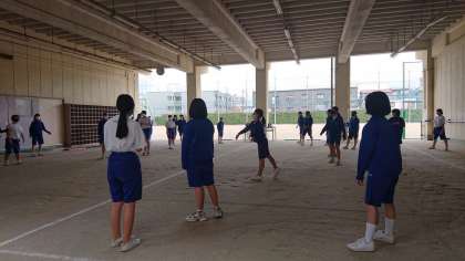 グラウンドは雨天のため使用できず、ピロティにて女子がドッ