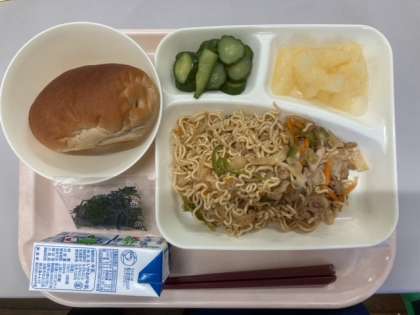 本日の給食は「焼きそば」と「黒糖パン」ということで、炭水化物が多いように思われるかもしれません。