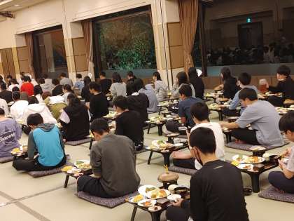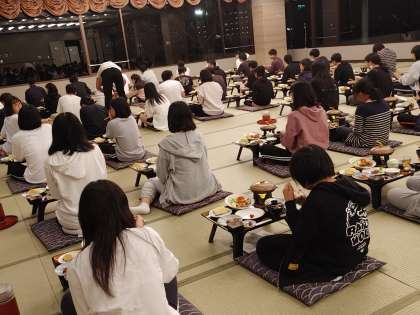 体験活動が終了した班から入館し、入浴を済ませ二部屋にわかれて夕食を食べています。みんな元気です。明日は一日中晴天であってほしいですね。