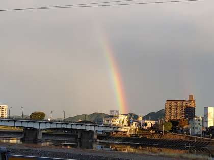おはようございます。六時半ごろ、旅館の横を流れる長良川を見ていると、大きな虹を発見。