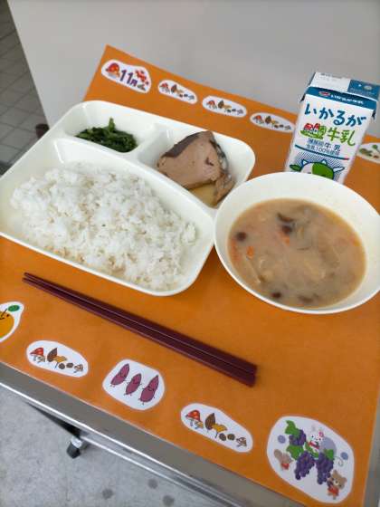 昨日の献立は『なまりぶしのしょうが煮、なめこのみそ汁、ほうれん草のごまあえ、ごはん、牛乳』でした。