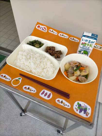 今日の献立は『くじらのたつたあげ、豚肉とじゃがいもの煮もの、きゅうりの赤じそあえ、ごはん、牛乳』です。