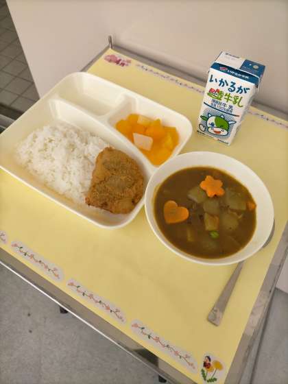 今日は、『カツカレーライス、フルーツゼリー、牛乳』です。1年生の入学と2.3年生の進級をお祝いする『入学祝い献立』です。