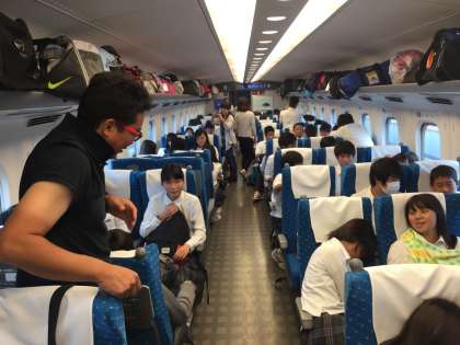 新幹線内では、トランプを楽しむグループ、寝てる人、思い思いに過ごしています。