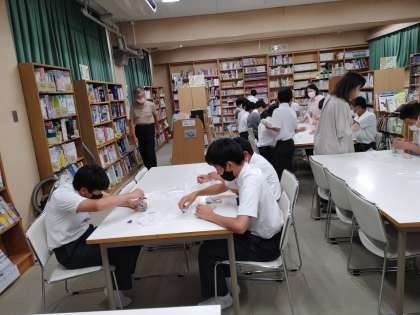 昼休み図書室で図書館開館とともに、元気アップ指導員さんのご指導のもと、マイ消臭剤をつくりました。