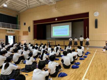 2年生の集会でも、食育委員会が朝食の大切さについて発表をしました。
