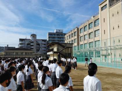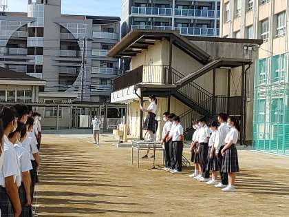 運動場が新しく整地されてはじめての全校集会でした。全校生徒が集合するのも6月の避難訓練以来です。