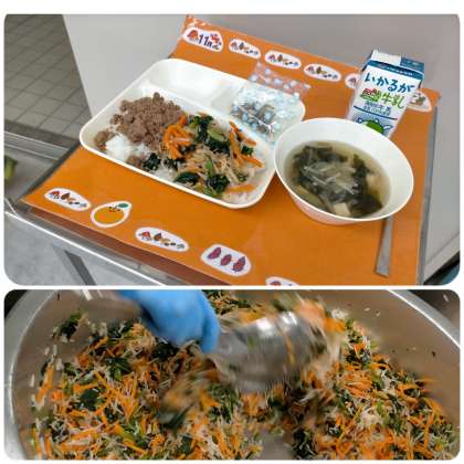今日の献立は『ビビンバ、わかめスープ、アーモンドフィッシュ、牛乳』でした。ビビンバは韓国・朝鮮料理のひとつです。ご飯とナムル、肉や卵などの具を入れよくかき混ぜて食べる料理です。給食でも人気の献立で、たくさんの野菜を使います。一人分のビビンバにはだいこん、ほうれん草、もやし、にんじん、合わせて90gもの野菜が入っています!たんぱく質、炭水化物、食物繊維などまざまな栄養素が摂れる栄養バランスのとれた献立です。ほうれん草の代わりに小松菜を使ったり、きゅうりを使ったりとその時期の旬の野菜をナムルにして季節のビビンバを楽しむことができます。