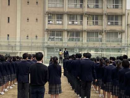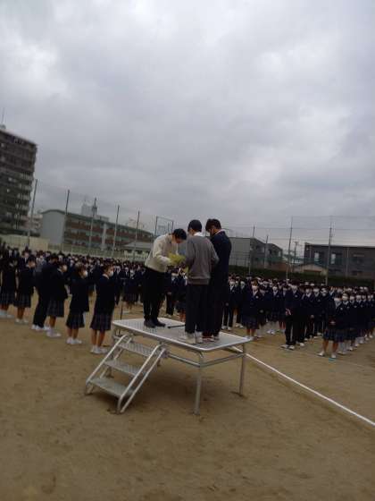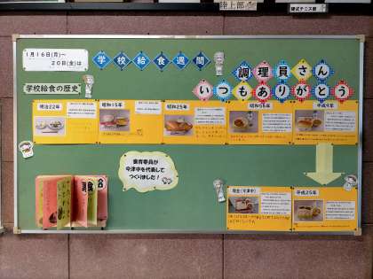 今津中学校では、16日(月)の全校集会で感謝状を給食調理員さんに渡しました。正門掲示板には、給食の歴史について食育委員で調べたものを掲示しています。