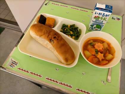 今日の献立は、「レーズンパン、ケチャップ煮、三度豆とコーンのソテー、焼きかぼちゃの甘みつかけ、牛乳」でした。