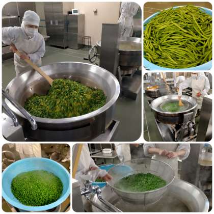 写真は、季節の食材である「三度豆」を給食室で調理しているところです。今日は鹿児島県から届きました。「さやいんげん」とも呼ばれる三度豆は、いんげん豆が大きくなる前にさやごと食べる野菜です。江戸時代に隠元禅師(中国のお坊さん)が伝えたとされています。ふだんは冷凍の三度豆を使用していますが、旬の5月には生のものが使えます。