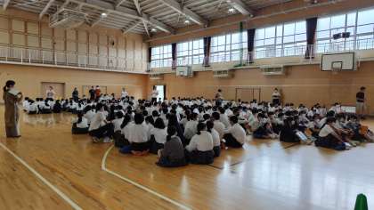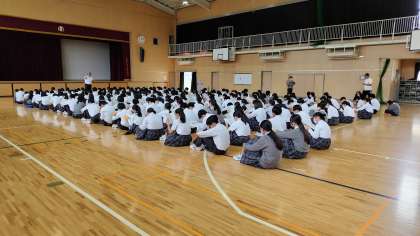 来週6月14日(水)〜16日(金)に実施される修学旅行に向けて、5時間目に各学級でレクを中心とした取組を、6時間目に2泊3日の行程中の動きや集合方法等、行動を交えながら体育館で確認しました。