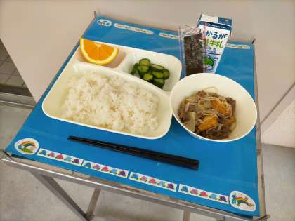 今日の献立は、「ご飯、すき焼き煮、きゅうりのしょうがづけ、焼きのり、オレンジ、牛乳」です。