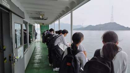 大久野島学習班が忠海港からフェリーに乗船し、大久野島に向かって出港しました。