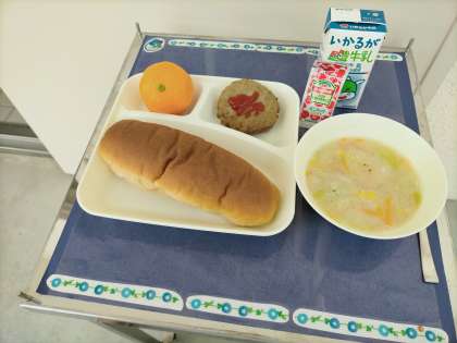 今日は、2学期初めての給食でした。献立は「黒糖パン、焼きハンバーグ、豆乳スープ、冷凍みかん、牛乳」です。