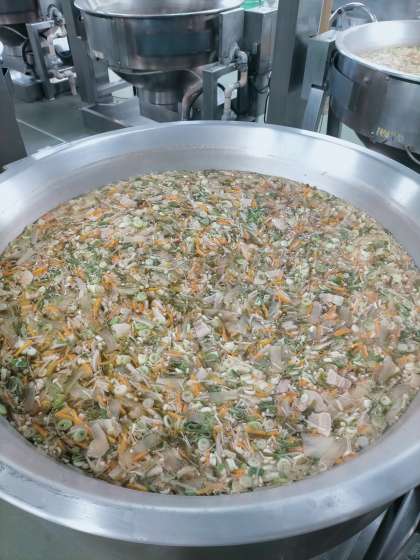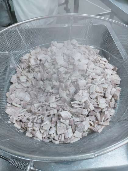 10月2日(月)に登場した「もずくと豚ひき肉のジューシー」に続き、本日も沖縄の料理「ソーキ汁」でした。ソーキ汁とは、豚の骨付きあばら肉を大根と一緒にやわらかく煮こんだ汁のことで、沖縄では「ハレの日」に食べる特別な料理だそうです。給食では、豚の骨付きあばら肉の代わりに「豚ばら肉」を使用しています。豚ばら肉は、余分な脂やアクを落とすために、1時間以上かけて下ゆでをしてから使っています。写真は左から、ゆでた後の豚ばら肉、ソーキ汁、今日の給食です。ほろほろと柔らかくなった豚ばら肉と切り昆布のうま味が出て、とても美味しい汁ものでした。